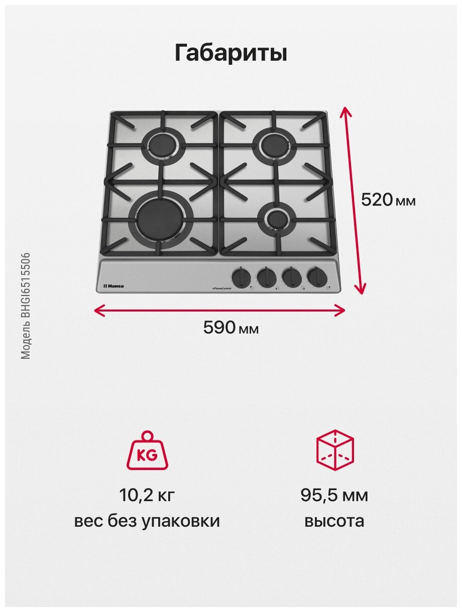 Газовая варочная панель Hansa BHGI6515506, встраиваемая, 60 см, газ-контроль и автоподжиг, 9 режимов регулировки пламени, чугунные решетки, нержавеющая сталь