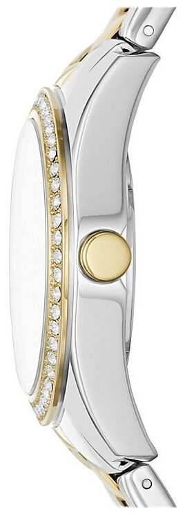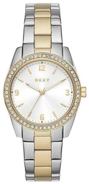 Лучшие цены. Женские кварцевые часы. Центральные часовая, минутная и секундная стрелки. Серебристый циферблат. Круглый корпус выполнен из полированной нержавеющей стали с частичным IP покрытием цвета желтого золота и декорирован кристаллами по безелю. Диаметр корпуса составляет 34 мм. Стальной браслет с частичным покрытием, раскладывающаяся застежка. Прочное минеральное стекло устойчивое к мелким механическим повреждениям. Водостойкость WR 50 (мытье рук, дождь). Магазины в вашем городе.