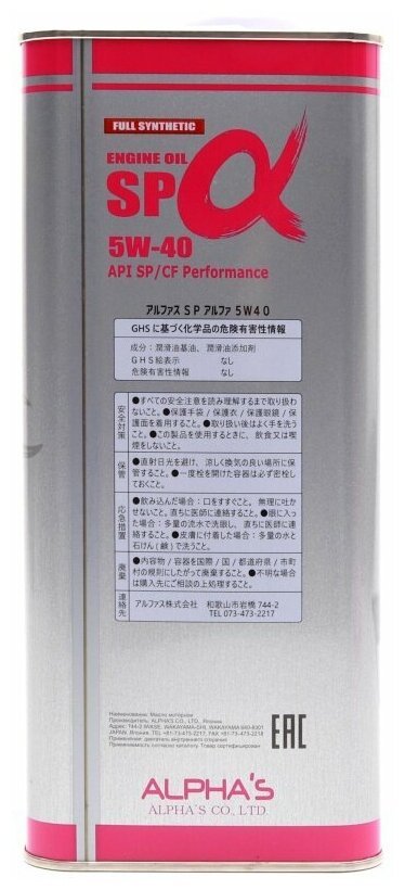 Лучшие цены. Код товара для заказа: 63001; Артикул: 809544; Бренд: ALPHA'S; основные характеристики: Состав: синтетическое; Тип двигателя: для бензинового двигателя; Вязкость по SAE: 5w40; спецификации И допуски: Класс по API: SN, SP, SN PLUS, CF; общие характеристики: Объем: 4 л; Масло моторное ALPHA'S 5w40 SN PLUS/SP/CF Моторное масло Alpha's SN 5W40 - это высококачественный японский продукт, разработанный в соответствии с самыми требовательными мировыми стандартами. Магазины в вашем городе.