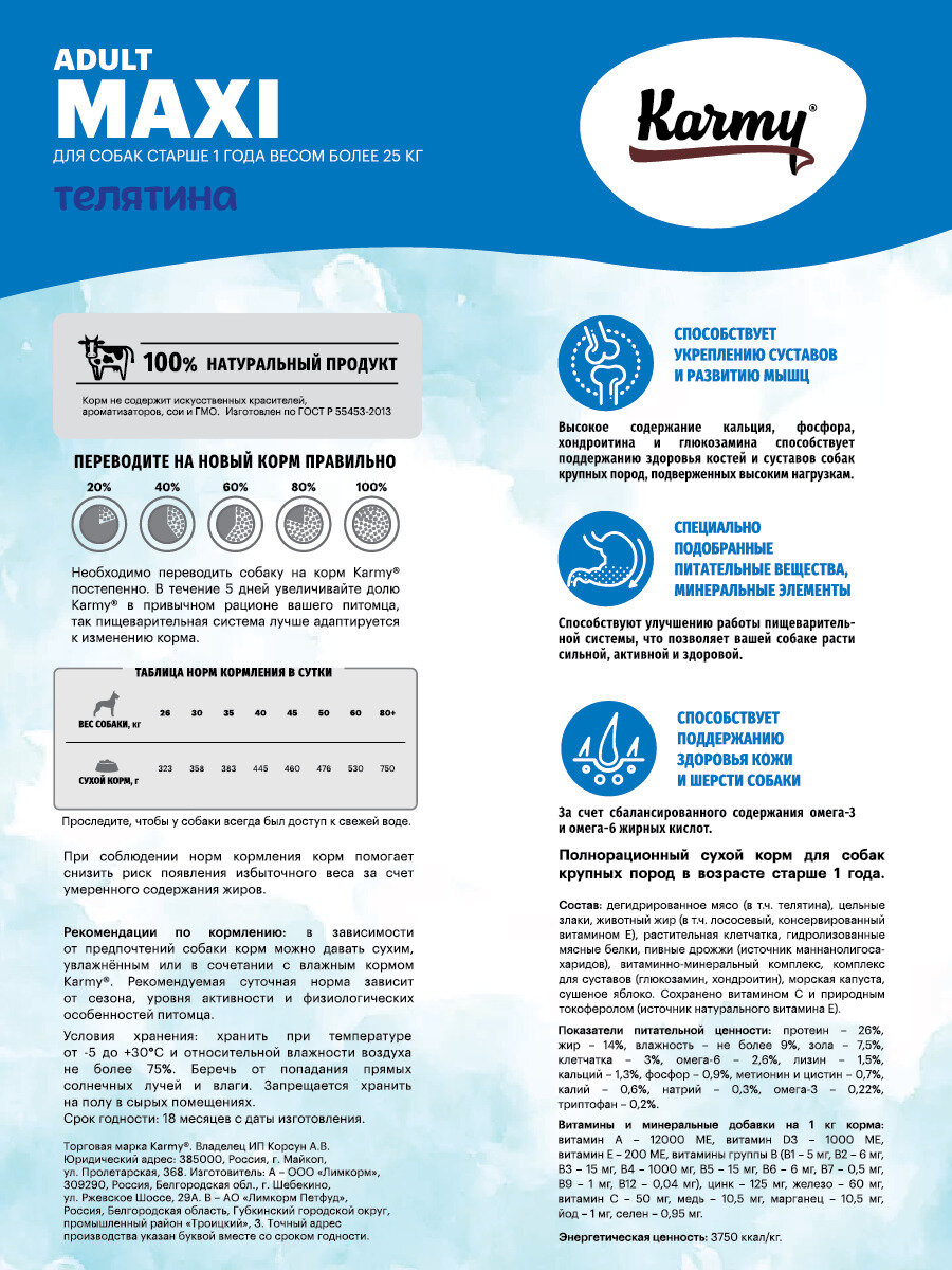 Корм для собак KARMY Макси Эдалт Телятина 14 кг д/взр. собак крупных пород