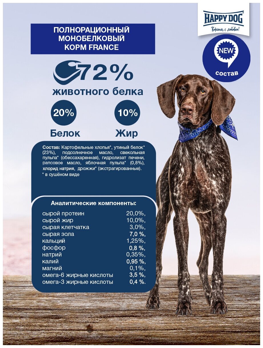 Лучшие цены. Беззерновой сбалансированный рацион для взрослых собак с чувствительным пищеварением с уткой и картофелем. Ключевые особенности: Беззерновой состав. Утка – единственный источник животного белка. Отборные ингредиенты с фермерских хозяйств. Высокая усвояемость. Бережное семейное производство в Германии. Природное разнообразие сырьевых компонентов. Без искусственных красителей, консервантов и ароматизаторов. Корм Happy Dog France разработан для собак средних и крупных пород с чувствительным пищеварением. Магазины в вашем городе.
