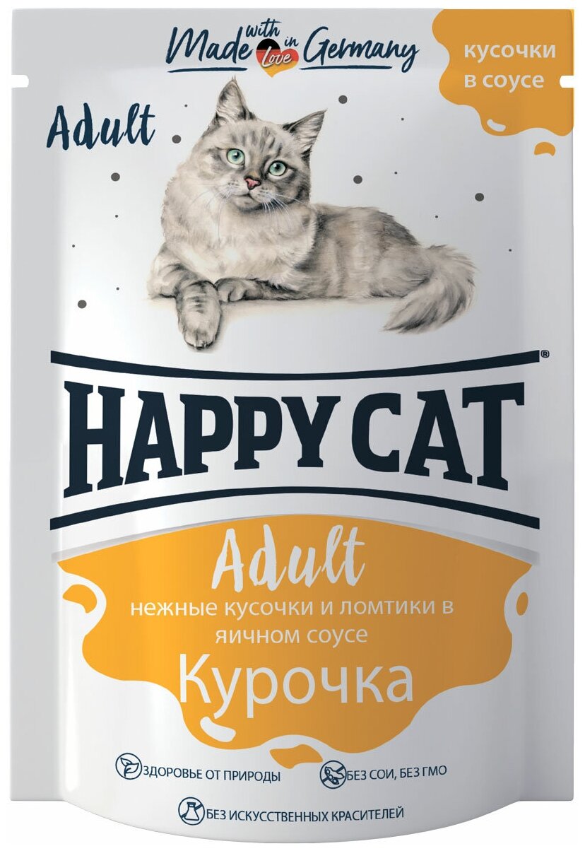 Лучшие цены. Деликатесный кормВ Happy CatВ курочка кусочки и ломтики в яичном соусе обеспечивает правильное и разнообразное питание кошки. В Этот вкусный и натуральный корм содержит качественно отобранные ингредиенты, чтобы порадовать даже самую привередливую кошку. В Уникальная технология приготовления позволяет сохранить все ценные свойства натуральных продуктов, чтобы ваш питомец был здоров и полон сил. В В Содержится инулин - натуральный пребиотик, улучшающий пищеварение вашего питомца. Магазины в вашем городе.