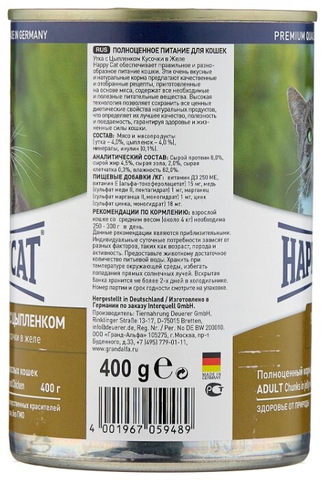 Happy Cat консервы для взрослых кошек с уткой и цыпленком в желе - 400 г х 12 шт (Россия)
