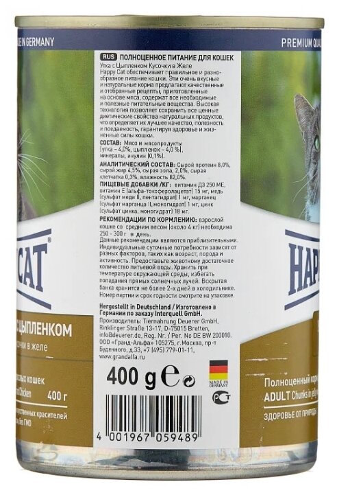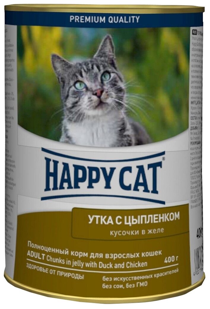 Happy Cat консервы для взрослых кошек с уткой и цыпленком в желе - 400 г х 12 шт (Россия)