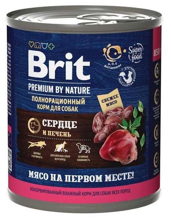 Корм для собак Brit Premium by Nature консервы с сердцем и печенью для взрослых собак всех пород 850 гр