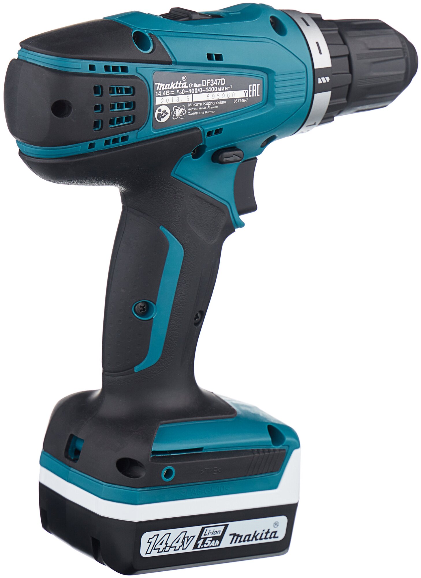 Дрель шуруповерт аккумуляторная MAKITA DF347DWE (Li-ion, 14.4В, 2АКБ 1.5Ач и ЗУ, 30/15Нм, БЗП 10мм, 2скор, 0-400-1400об/мин, 1.4кг, кейс)