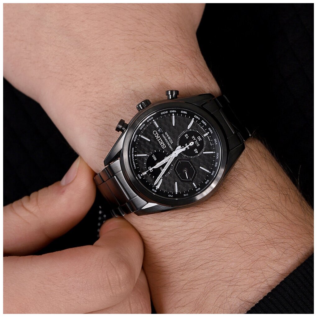 Лучшие цены. Мужской кварцевый хронограф на солнечной батарее. Запас хода при полной зарядке до 6 месяцев. Калибр механизма V176. Функция предотвращения перезарядки. Центральные часовая и минутная стрелки, секундная стрелка вынесена на малый циферблат. Апертура даты в позиции 3 часов. Секундомер. Черный циферблат. Люминесцентные стрелки и метки. Корпус выполнен из матовой нержавеющей стали с черным PVD покрытием. Диаметр корпуса составляет 41 мм, толщина 12 мм. Магазины в вашем городе.