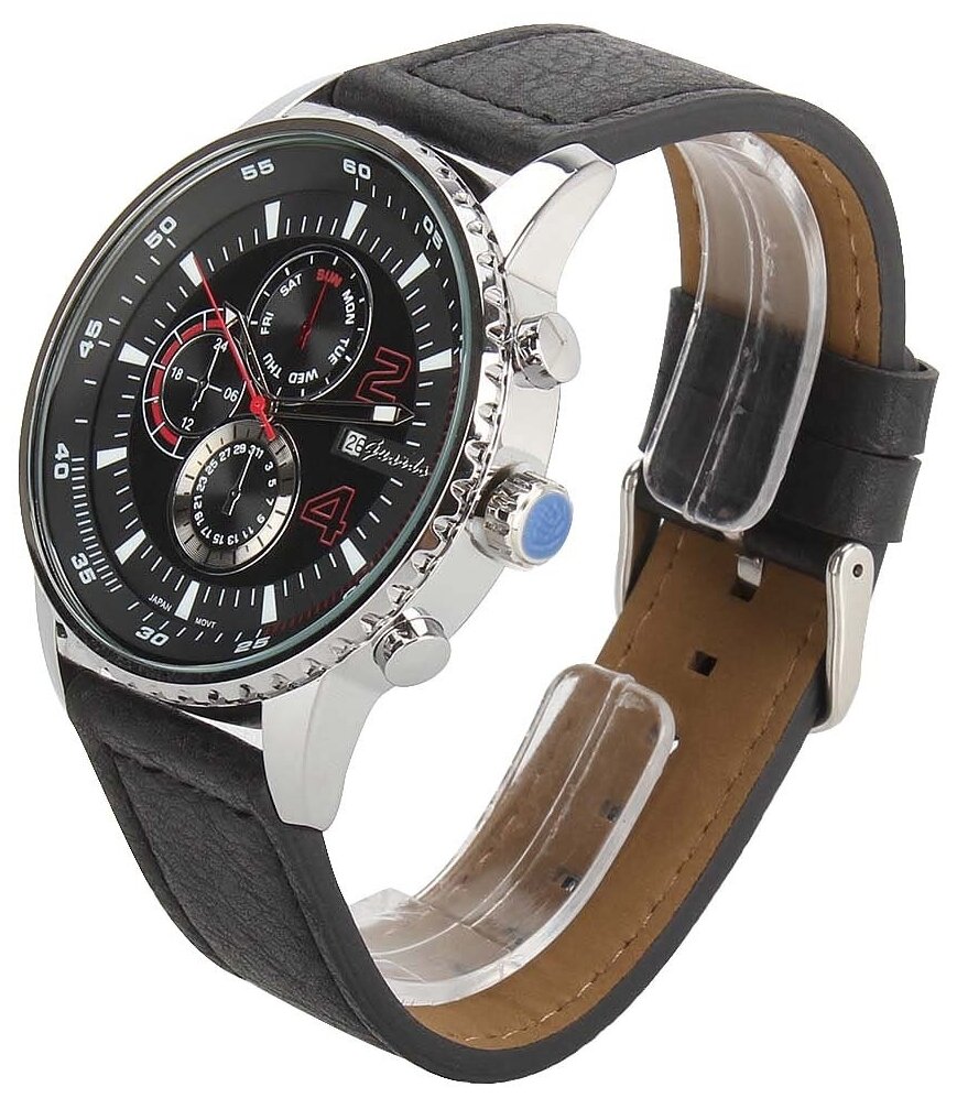 Лучшие цены. Технические характеристики: кварцевый часовой механизм (Япония), отображает минуты, секунды, часы, дата. Настройка осуществляется с помощью установочного штифта, расположенного справа по корпусу. Влагозащищенные. Есть 2 боковые декоративные кнопки и два дополнительных декоративных циферблата. Материалы корпуса: полированная нержавеющая сталь, минеральное стекло. Материал ремешка: искусственная кожа. Диаметр: 4,5 см. Высота: 1 см. Ширина ремешка: 2,3 см. Максимальный обхват запястья 26 см. Магазины в вашем городе.