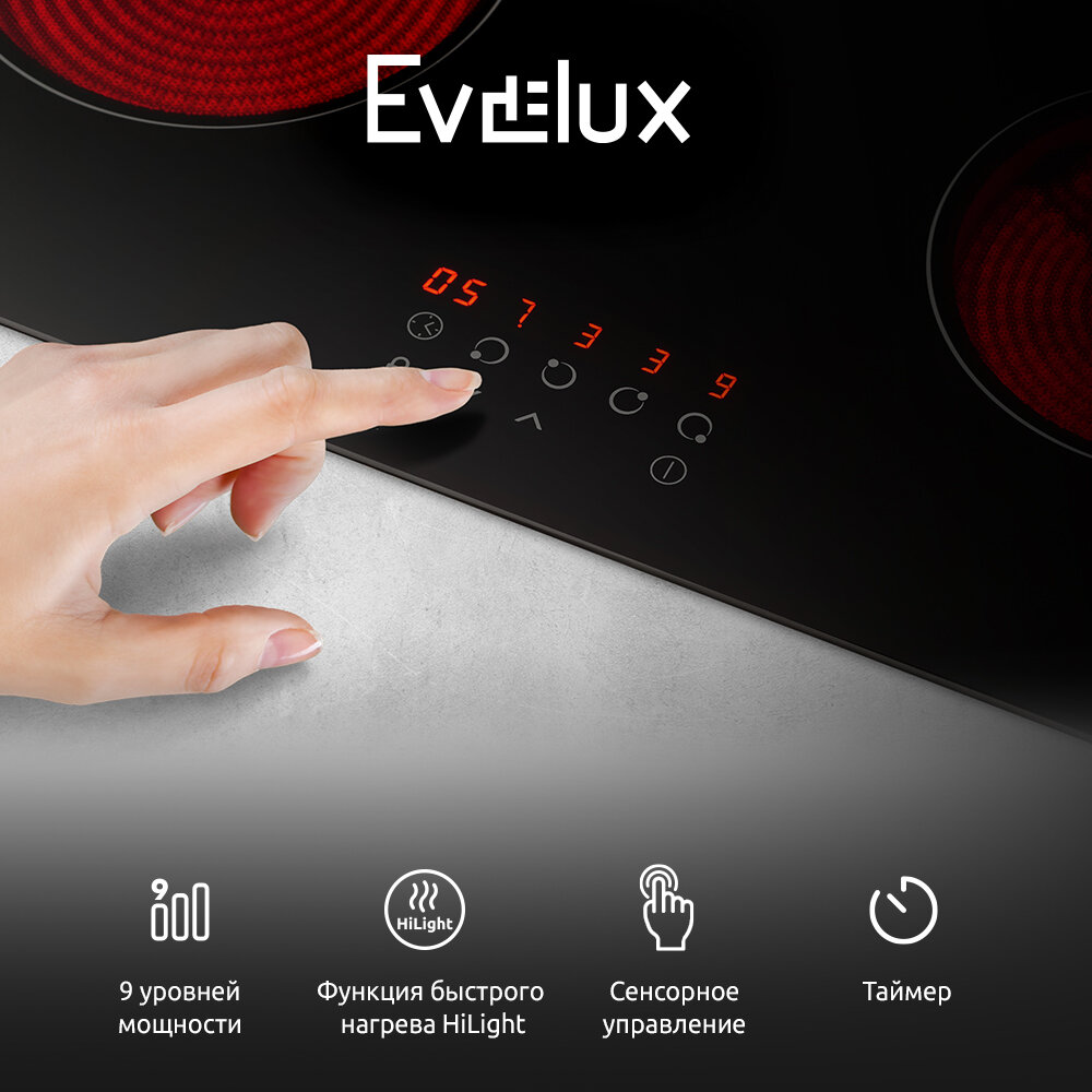 Варочная панель EVELUX электрическая, стеклокерамика, Hi Light, 60 см, 4 конфорки, сенсорное управление, 9 уровней мощности, таймер 1-99 мин, блокировка управления, защитное отключение, 6000 Вт, черное стекло, 590х520х50 мм.