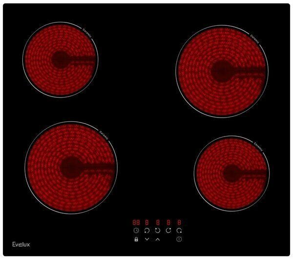 Варочная панель EVELUX электрическая, стеклокерамика, Hi Light, 60 см, 4 конфорки, сенсорное управление, 9 уровней мощности, таймер 1-99 мин, блокировка управления, защитное отключение, 6000 Вт, черное стекло, 590х520х50 мм.