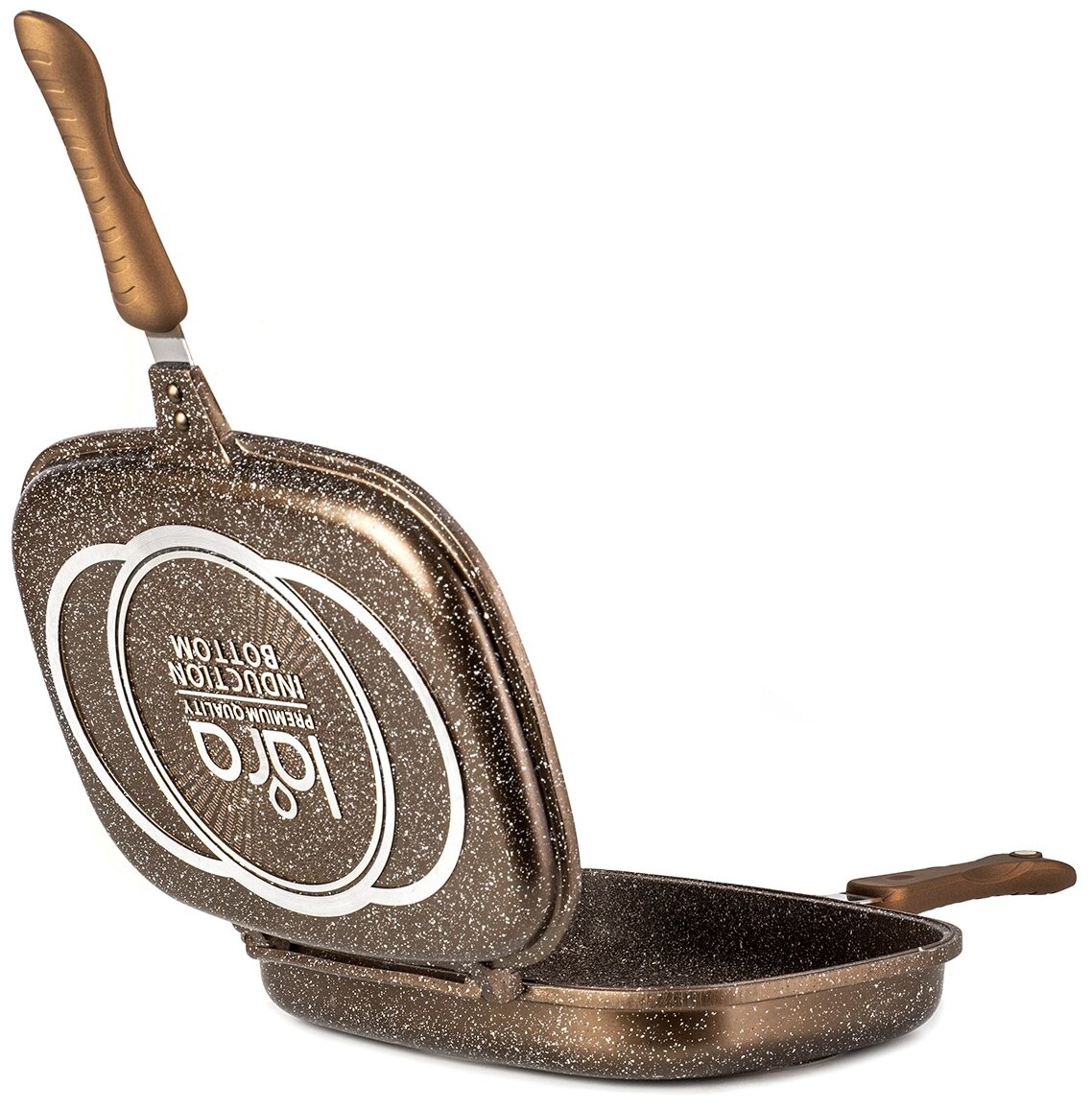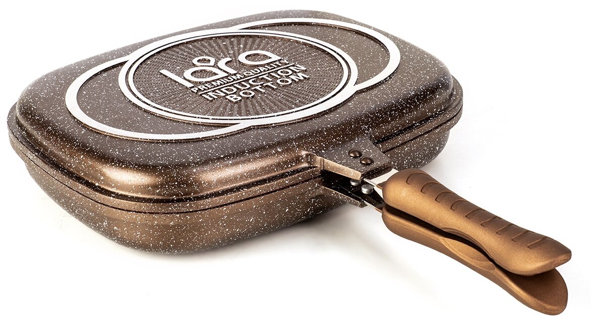 Лучшие цены. Двойная алюминиевая сковорода-гриль LARA серии «Rio» – это по-настоящему хороший подарок каждому увлеченному кулинару. Она прекрасно подойдет для приготовления сочных стейков, овощей гриль, цыпленка табака и множества других блюд. Антипригарное мраморное покрытие надежно защищает дно и стенки от повреждений. В сложенном состоянии сковорода прекрасно сохраняет температуру и доводит блюдо до готовности. На корпусе есть пароотвод. Магазины в вашем городе.