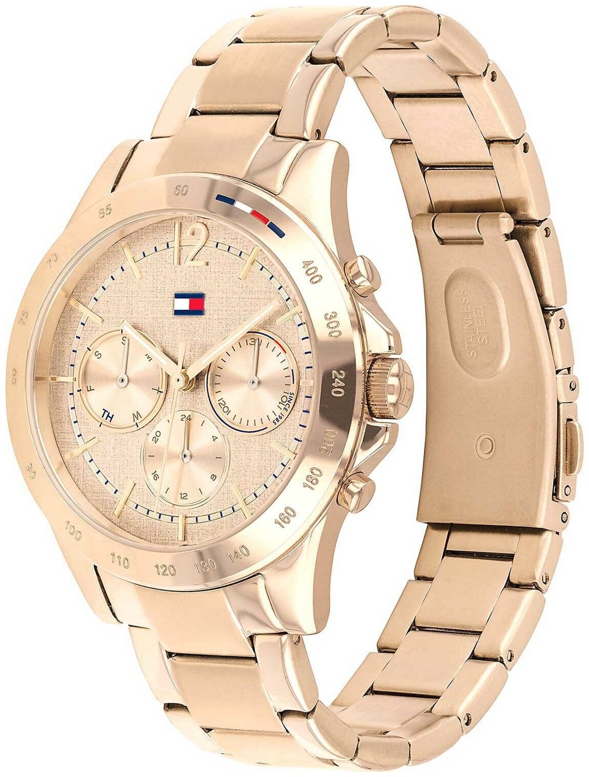 Лучшие цены. Функциональные женские наручные часы Tommy Hilfiger. На отдельных циферблатах отображаются число, день недели и текущее время в 24- часовом формате. На безель нанесена тахиметрическая шкала. Заводная головка с защитой. Браслет с раскладывающейся застежкой. Гарантия 2 года. Функции: День недели. Число. Комплектация: Часы, фирменная упаковка, инструкция на русском языке, заполненный гарантийный талон. Магазины в вашем городе.