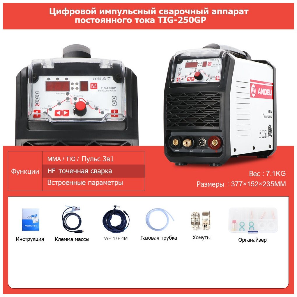 Лучшие цены. Инверторный импульсный сварочный аппарат для аргонодуговой сварки. Имеет три функции: дуговая сварка постоянным током, TIG-сварка постоянным током, импульсная TIG-сварка постоянным током. Встроенная функция регулировки параметров, и канал хранения цифровых параметров упрощают сварку и делают ее более удобной. Функция ранней подачи газа, задержки отключения подачи газа, набора тока, затухания тока, непрерывная подстройка режима и частоты импульса. Легкое формирование чешуйчатой поверхности шва. Магазины в вашем городе.