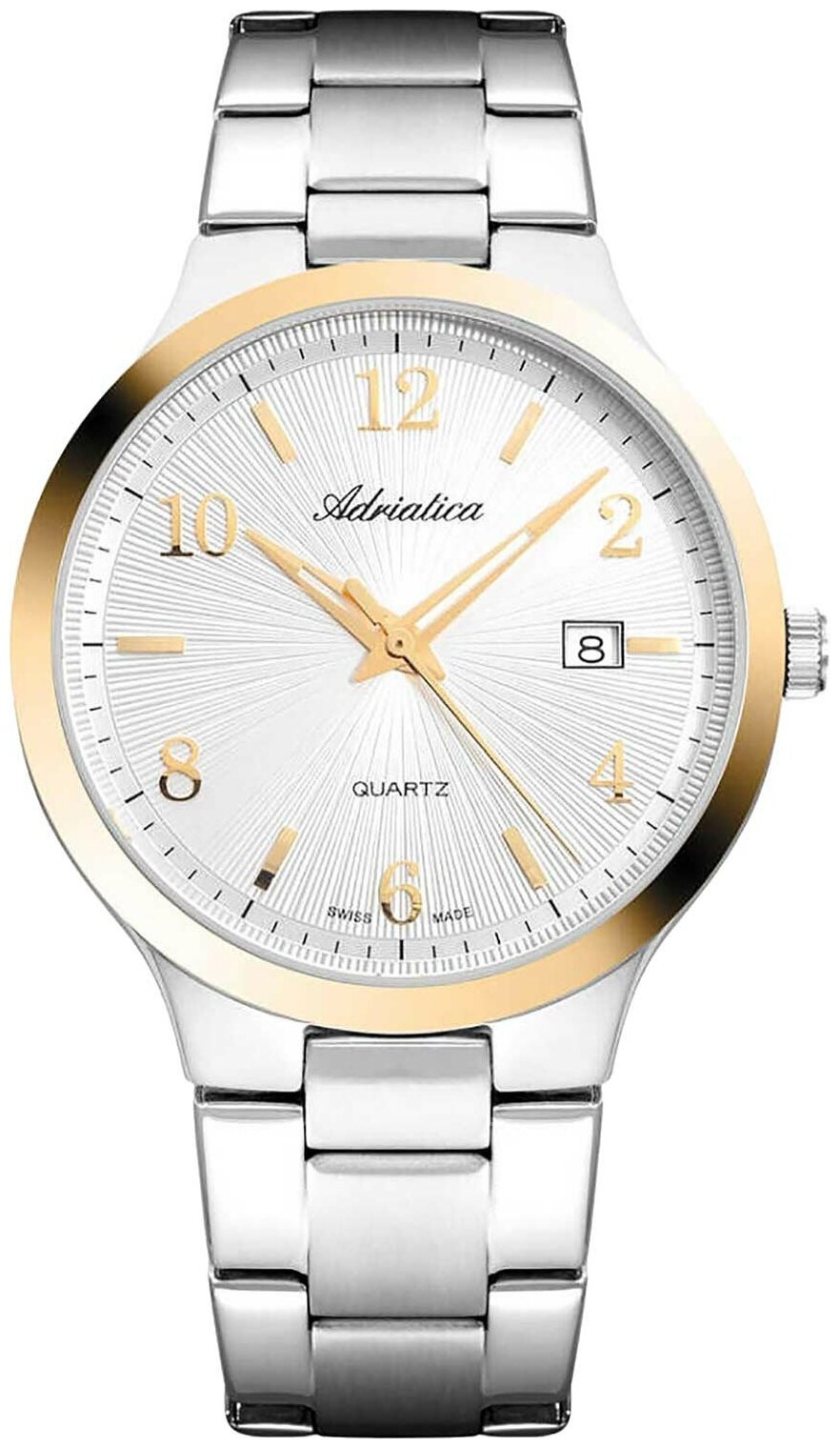 Лучшие цены. Кварцевые часы. Водостойкость WR 50. Центральные часовая, минутная и секундная стрелки. Индикация даты. Серебристый циферблат с часовыми индексами в виде штрихов и цифр. Корпус выполнен из нержавеющей стали с частичным PVD покрытием. Диаметр корпуса 41 мм, толщина 9 мм. Устойчивое к возникновению мелких механических повреждений сапфировое стекло. Браслет выполнен из нержавеющей стали. Магазины в вашем городе.