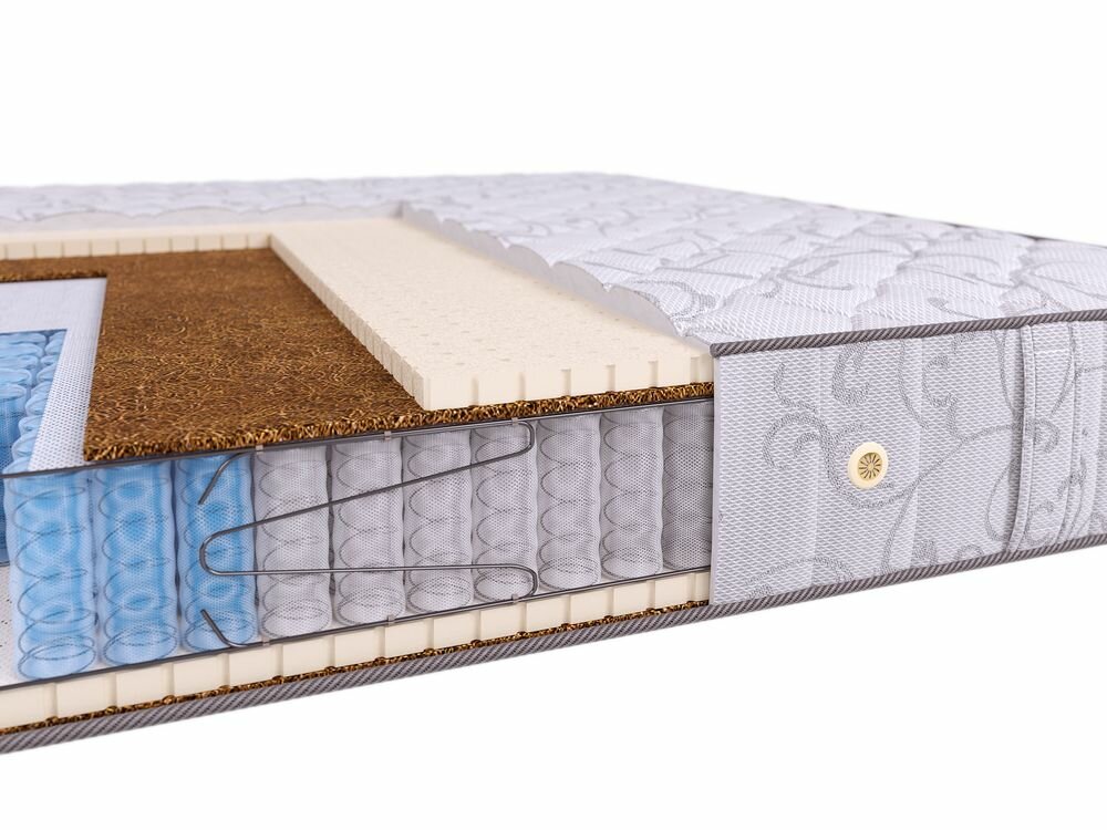 Лучшие цены. Матрас Hit Middle S1200 средней жесткости выполнен из натуральных материалов: латексированной кокосовой койры и натурального латекса на независимом 5-ти зональном пружинном блоке «Multipocket» (500 пр/м2) с усилением по периметру Z пружинами, который равномерно распределяется нагрузку тела и создает правильную поддержку позвоночника во время сна. Матрас выполнен методом пристрелки без применения клея. Чехол матраса выполнен из объемной двойной жаккардовой ткани. Магазины в вашем городе.