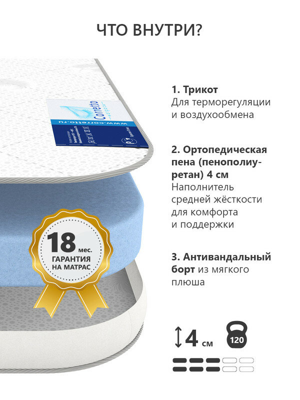 Лучшие цены. Беспружинный матрас Corretto Roll Flex Light Foam 4 для кровати, дивана или раскладушки размером 75х220 см или 750х2200 мм. Рекомендуем использовать защитный наматрасник Corretto Protect или непромокаемый чехол Corretto Waterless для увеличения срока службы матраса и предотвращения загрязнений. Особенности матраса: Ортопедическая пена или ППУ. Универсальный гипоаллергенный наполнитель, хорошо держит форму и способствует естественному положению тела. Магазины в вашем городе.