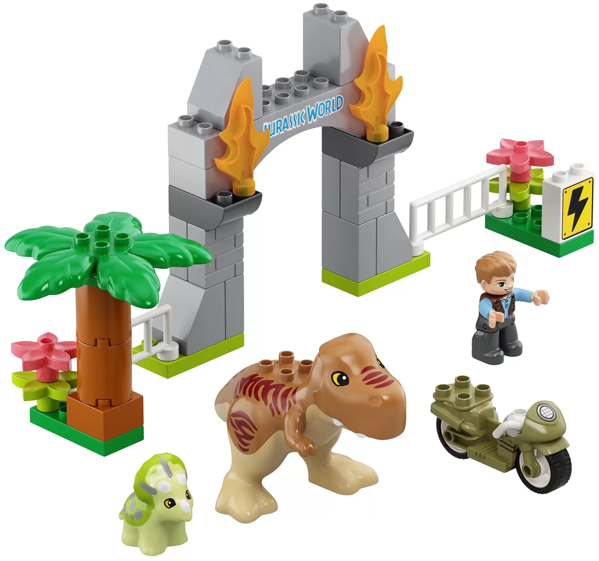 Лучшие цены. В наборе «Побег динозавров: тираннозавр и трицератопс» LEGO® DUPLO® Jurassic World (10939) вас ждет множество интересных функций и приключений из фильма «Мир юрского периода», так что дети, которые любят динозавров, будут реветь от восторга. Развивающий набор с динозаврами Когда тираннозавр проломится через знаменитые ворота «Мира юрского периода», юные поклонники динозавров должны будут помочь Оуэну спасти малыша-трицератопса и на мотоцикле отвезти его в безопасное место. Магазины в вашем городе.