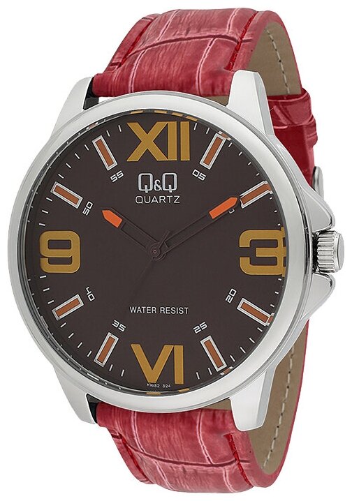 Лучшие цены. Мужские японские наручные часы Q&Q KW82-824 [KW82 J824Y]. Кварцевый механизм в высокой точностью +/-20 сек в месяц. Прочное, устойчивое к царапинам, минеральное стекло обеспечит защиту часов от повреждений. Водонепроницаемость 30WR (3 Бар) защитит Ваши часы от брызг и дождя, но плавать в них нельзя. Ударопрочный корпус часов сделан из нержавеющей стали с высокими антикоррозийными свойствами. Ремешок из высококачественной натуральной кожи с классической застежкой – это стильно, удобно и практично. Магазины в вашем городе.