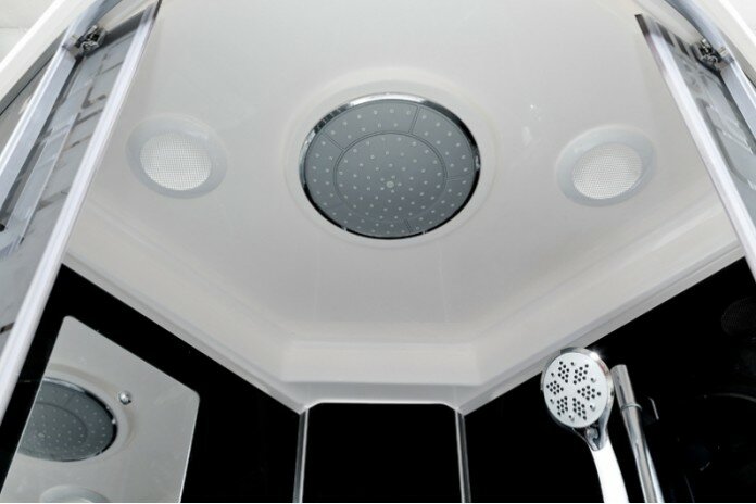 Лучшие цены. Размер: 100 x 100 x 220 см Особенности: с крышей безсиликоновая сборка тропический душ вентиляция LED подсветка сенсорный пульт радио резьбовые соединения смесителя 100% акриловый поддон высотой 45 см, усиленный металлическим закаленное сверхпрочное стекло шиншилла с узором толщина 5 мм верхний и ручной душ оснащен системой Easy Clean черный задние стенки душевая лейка на штанге с силиконовыми форсунками зеркало, две полочки шланг 1,5 метра Anti-Twist (не скручивается). Магазины в вашем городе.