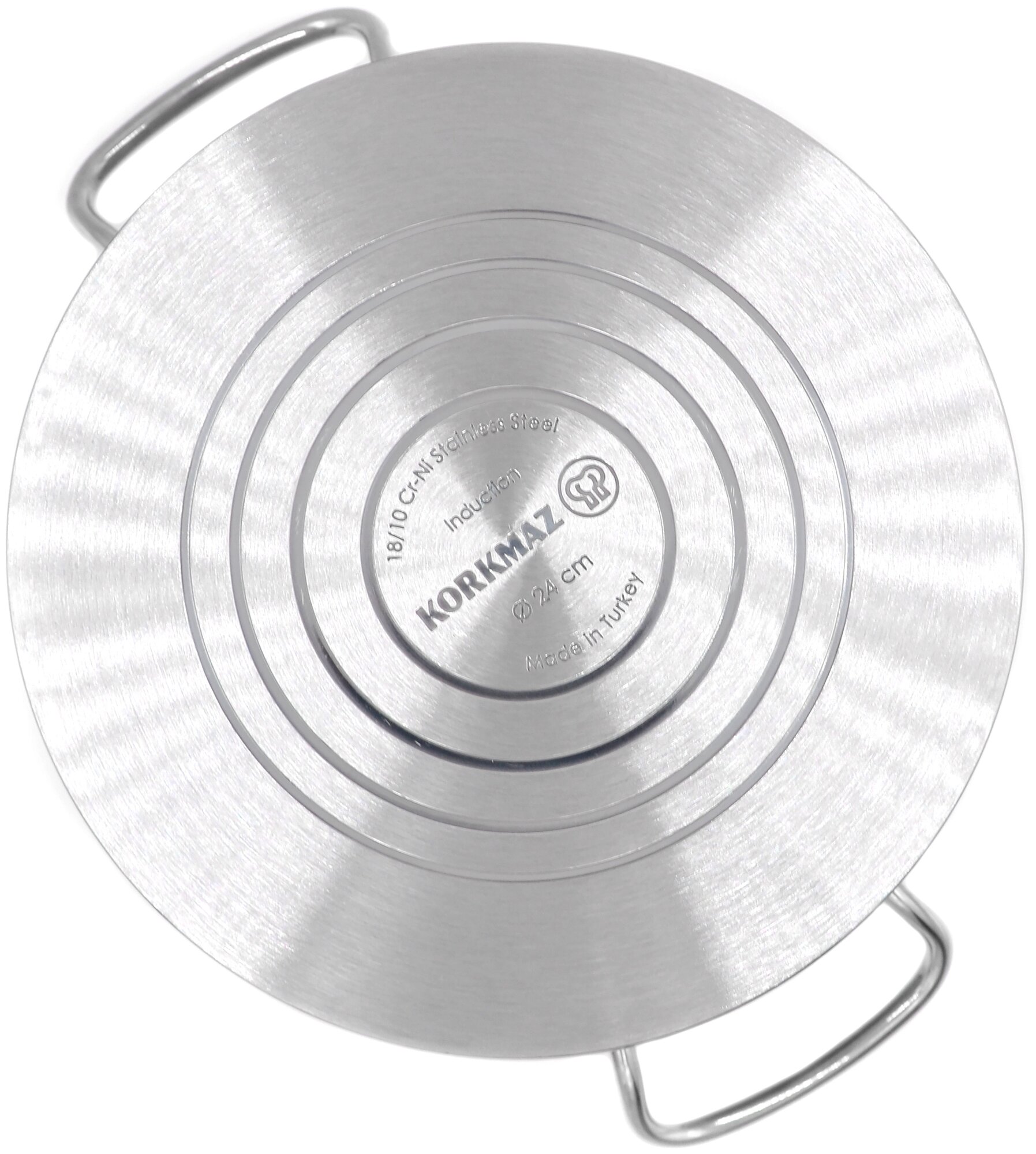 Лучшие цены. Турецкая компания Korkmaz использует самые передовые и экологически чистые технологии в разработке новых продуктов и производственном процессе. Кастрюля "Pro Line" 24x14 см / 6,2 л из нержавеющей стали 18/10 с металлической крышкой и металлическими ручками займет почетное место на вашей кухне. Для серии PROLINE в производстве используется нержавеющая сталь 18/10 высокого качества. Толщина стенок 1 мм, толщина дна 1мм. Магазины в вашем городе.