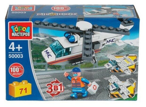 Лучшие цены. Конструктор 3 в 1 «Вертолёт службы спасения» ТМ «Город мастеров» понравится маленьким спасателям. Особенности и комплектация: - 71 деталь - фигурка - 3 варианта сборки - совместим с моделями конструкторов мировых брендов - все детали легко и плотно соединяются между собой С помощью этого занимательного конструктора ваш ребёнок может собрать 3 варианта моделей воздушного транспорта службы спасения. Набор вдохновит малыша на новые увлекательные сюжеты для игр и станет гордостью его игрушечной коллекции. Магазины в вашем городе.