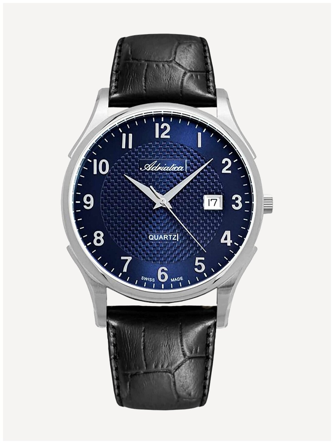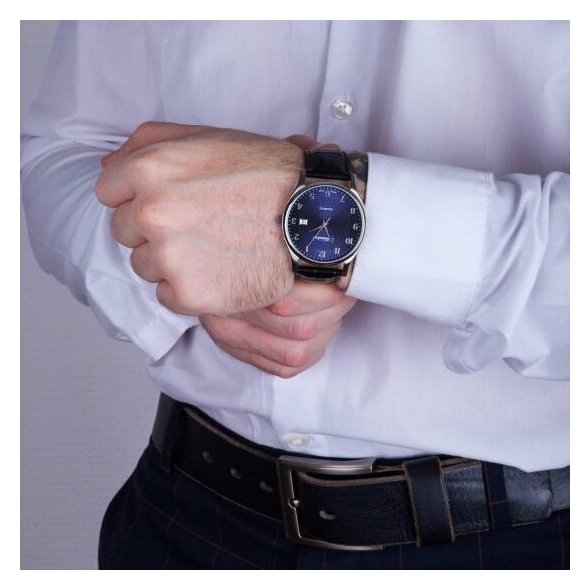 Лучшие цены. Кварцевые часы. Водостойкость WR 30. Центральные часовая, минутная и секундная стрелки. Индикация даты. Синий циферблат с часовыми индексами в виде цифр. Корпус выполнен из нержавеющей стали. Диаметр корпуса 41 мм, толщина 7 мм. Устойчивое к возникновению мелких механических повреждений сапфировое стекло. Кожаный ремешок черного цвета. Магазины в вашем городе.