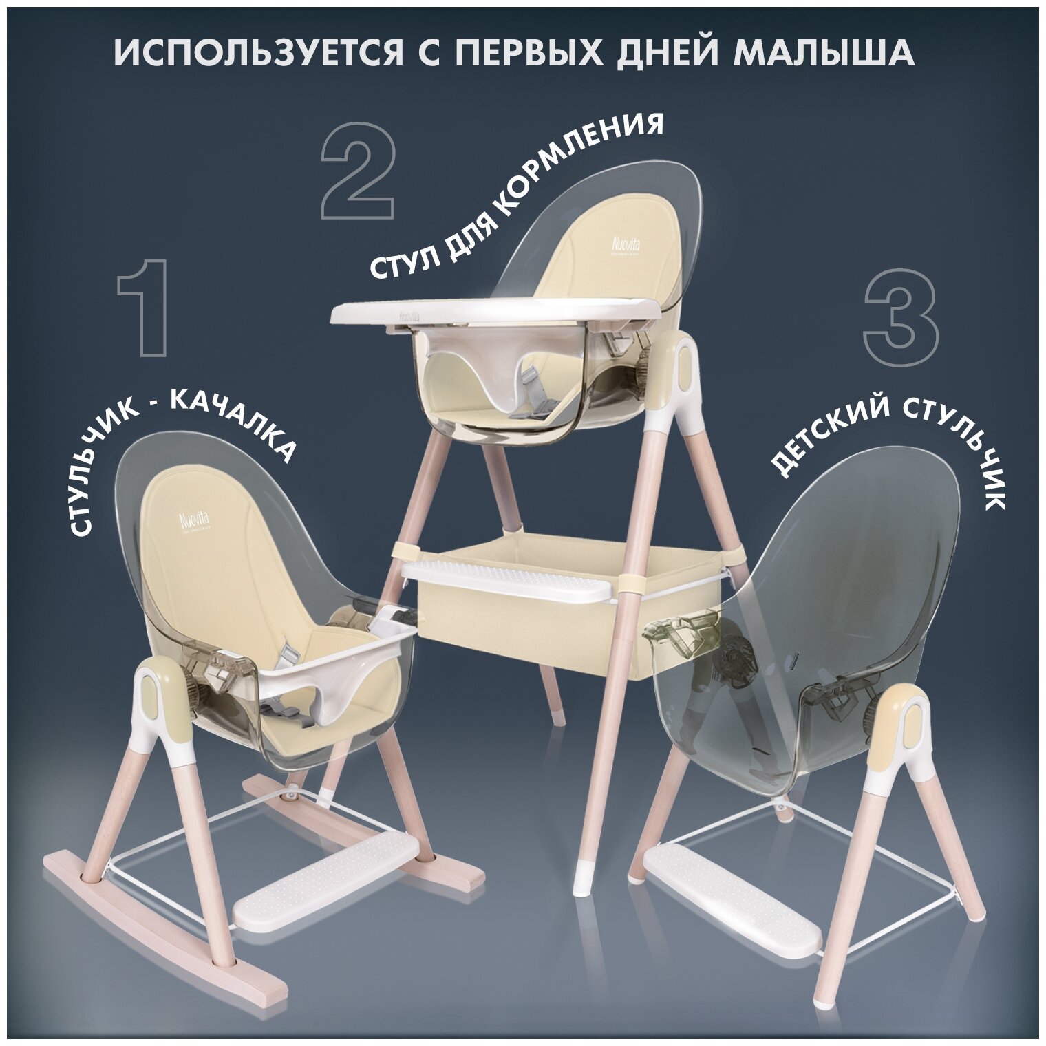 Лучшие цены. Детский стульчик Nuovita GOURMET LUX 3 в 1 разработан для новорожденных с первых дней жизни и незаменим для семьи с малышом. Модель учитывает самые современные тенденции: это качалка-шезлонг, детский стульчик для кормления и низкий стул с эргономичным креслом-чашей. Итальянский бренд использует экологичные и долговечные материалы — натуральный массив дерева, ударопрочный пластик, экокожу. Изделие выдерживает вес до 15 кг, но за счет лаконичного дизайна смотрится изящно и невесомо. Магазины в вашем городе.