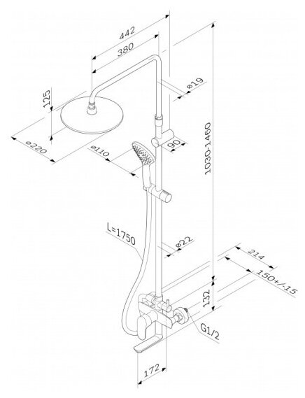 | Комплектация | ручной душ (душевая лейка) / верхний душ (тропический) / смеситель / стойка / штанга / душевой шланг / крепление ручного душа |