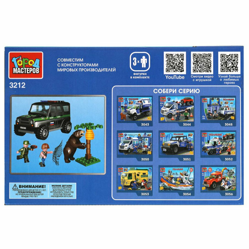 Лучшие цены. Конструктор «УАЗ Hunter. Лесная полиция» ТМ «Город мастеров» понравится маленьким защитникам природы. Особенности и комплектация: 89 деталей 3 фигурки оружие стреляет совместим с моделями конструкторов мировых брендов все детали легко и плотно соединяются между собой С помощью этого занимательного конструктора ваш ребёнок может собрать реалистичную модель машины лесной охраны и помочь отважному егерю спасти медведя от браконьера. Магазины в вашем городе.