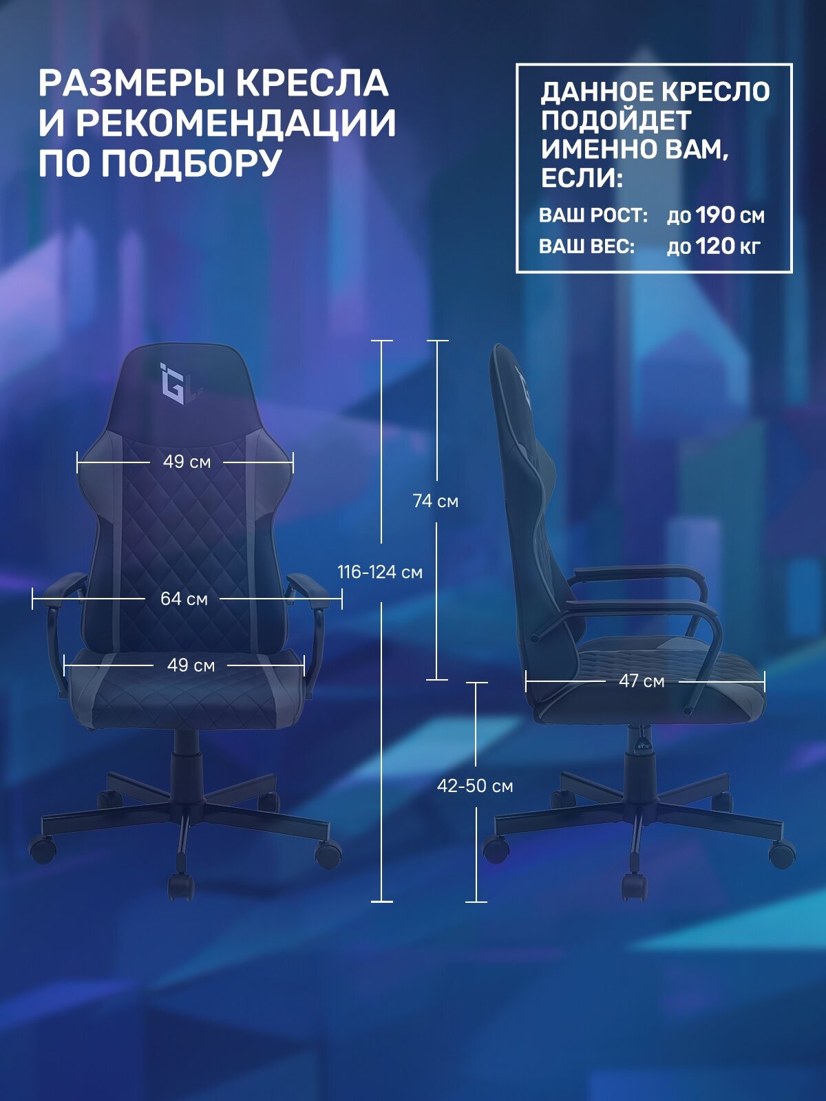 Лучшие цены. Стильный «геймерский» дизайн. Плотный пенный наполнитель. Надежная стальная рама с толщиной стенок 0.8 мм. Прочная экокожа на спинке и сиденье. Усиленная строчка на сиденье и спинке. Механизм топган с блокировкой качания. Фиксированные подлокотники из полиуретана. Настраиваемая высота кресла . Газлифт 3 класса. Максимальная нагрузка – до 120 кг. Металлическое основание. Тихие и надежные 50 мм колеса из полиуретана. Вышитые логотипы GL на подголовнике и спинке. Магазины в вашем городе.
