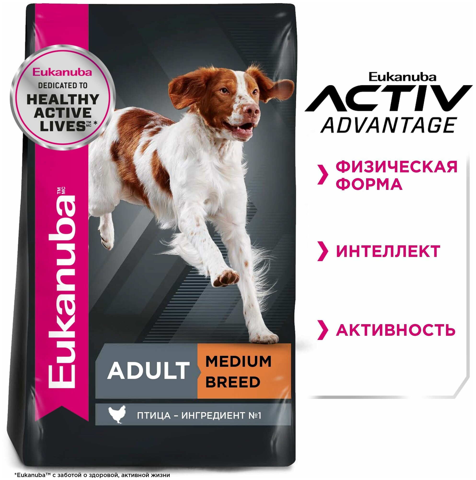 Лучшие цены. Eukanuba Adult Medium Breed - сухой полнорационный корм с птицей для взрослых собак средних пород весом от 11 до 24 кг от года и старше. Птица - ингредиент №1 в корме. 1. Физическая форма. Белки животного происхождения в сочетании с глюкозамином и хондроитинсульфатом помогают сохранить нормальную мышечную массу, а также подвижность суставов. 2. Интеллект. DHA (ДГК) и антиоксиданты для поддержания эффективной работы мозга. 3. Активность. Магазины в вашем городе.