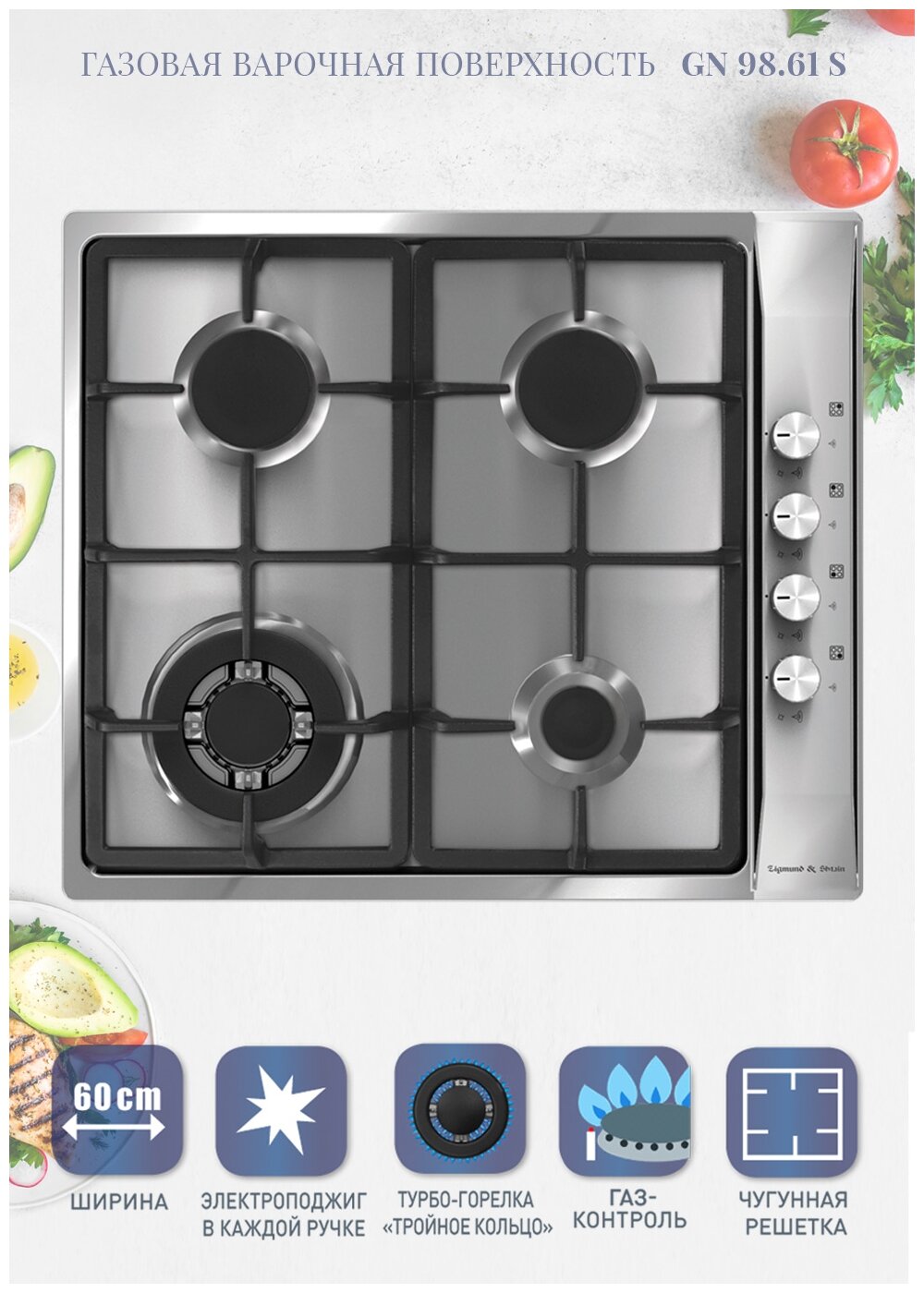 Лучшие цены. Газовая варочная панель Zigmund & Shtain GN 98.61 S Особенности: Встраиваемая газовая поверхность Боковое управление Поворотные переключатели Электроподжиг в каждой ручке Газ-контроль Тройное кольцо пламени Эмалированные решётки Переходники для разных типов газа в комплекте Характеристики: Ширина 60см Мощность горелок 1 горелка – 3000 Вт 2 горелки – 1600 Вт 1 горелка – 1000 Вт. Магазины в вашем городе.