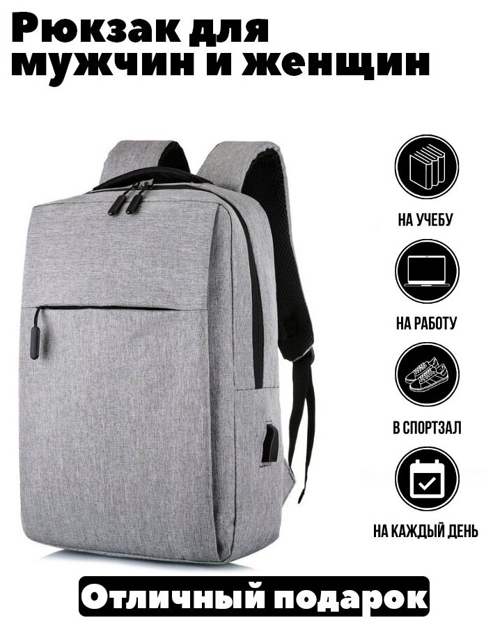 Рюкзаки Стильный рюкзак с USB и отделением для ноутбука до 15.6", вместительный, водоотталкивающий, серый