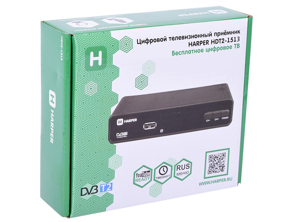 Лучшие цены. Цифровой телевизионный DVB-T2 ресивер HARPER HDT2-1513 Черный, Full HD, DVB-T, DVB-T2, поддержка внешних жестких дисков. Магазины в вашем городе.