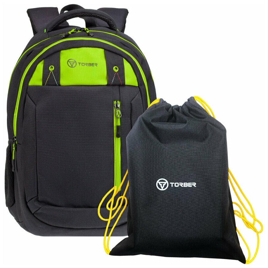 Школьные рюкзаки и ранцы Школьный рюкзак TORBER CLASS X, черный с зеленой вставкой, полиэстер 900D, 45 x 32 x 16 см +Мешок для сменной обуви в подарок!