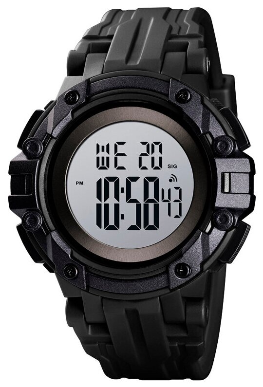 Лучшие цены. Модель наручных часов SKMEI 1545 имеет динамичный обтекаемый корпус из ударопрочного ABS пластика, обеспечивающего надежную защиту механизма, а большой контрастный ЖК-дисплей защищен прочным стеклом из композитных материалов. Черный экран с очень яркой подсветкой видно даже при очень ярком солнце. Корпус часов водостойкий до 5 АТМ. Имеется будильник, ежечасный сигнал, дата, секундомер, подсветка и формат времени 12/24. Вес всего 48 г. Магазины в вашем городе.