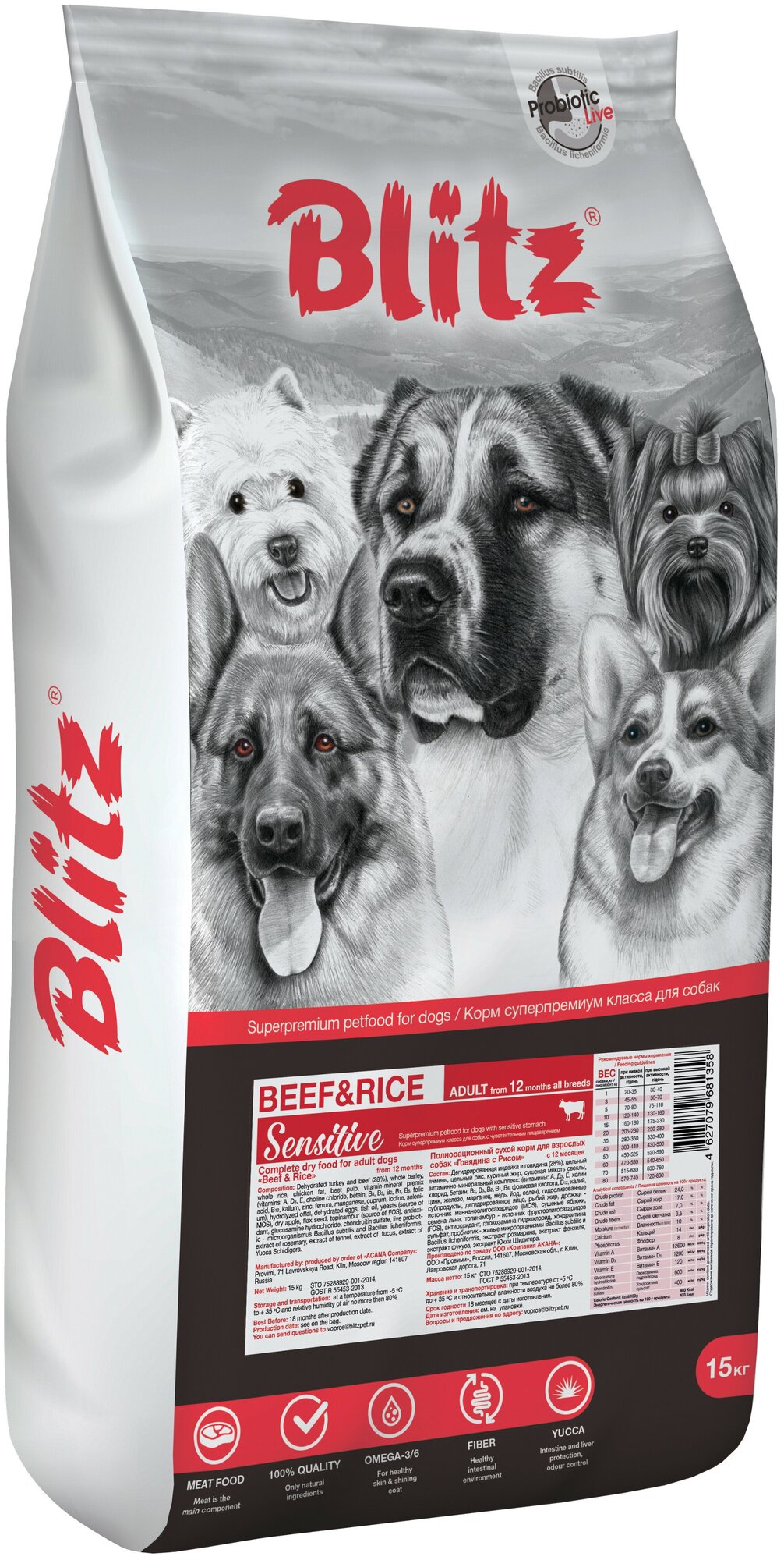 Сухой корм для собак Blitz Sensitive, говядина с рисом 1 уп. х 1 шт. х 15 кг