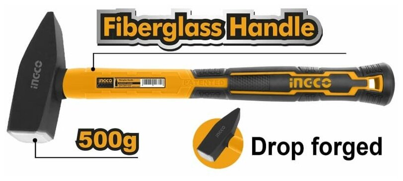 Молоток слесарный, 45 углеродистая сталь, фиберглассовая рукоятка, 500гр, INGCO HMH880500