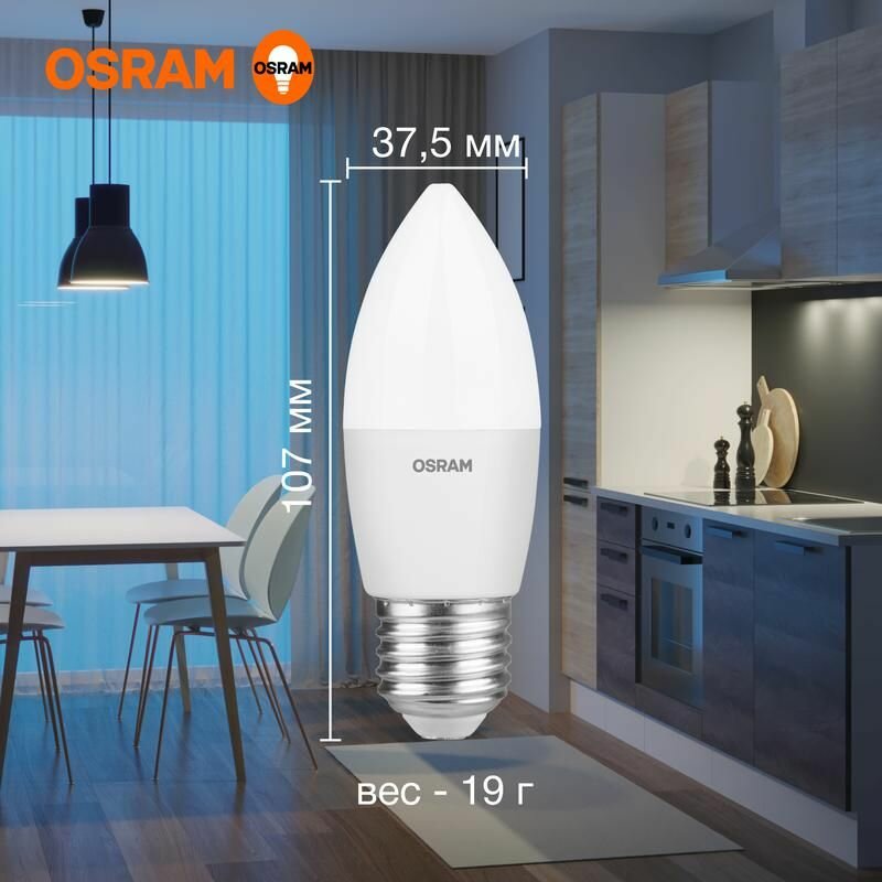 Лампочка светодиодная OSRAM LED Value B, 560лм, 7Вт (замена 60Вт), 3000К (теплый белый свет), Цоколь E27, Свеча, 1 шт