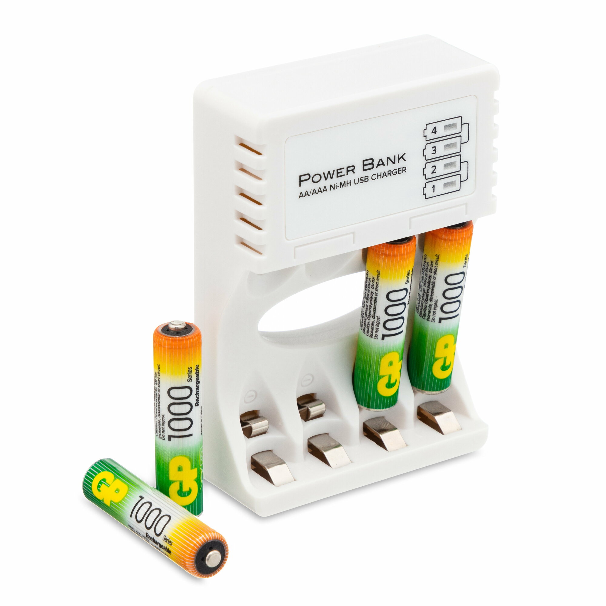 Зарядка аккумуляторных батареек Зарядное устройство + аккумуляторы GP USB + 4 аккум. АA A(HR03) 1000mAh (GP 100AAAHC/CPB-2CR4)