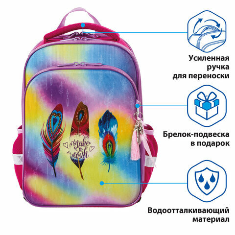 Ранец (рюкзак) школьный для девочки первоклассницы Brauberg Quadro, 3 отделения, с брелком, Plumage, 37х28х18 см