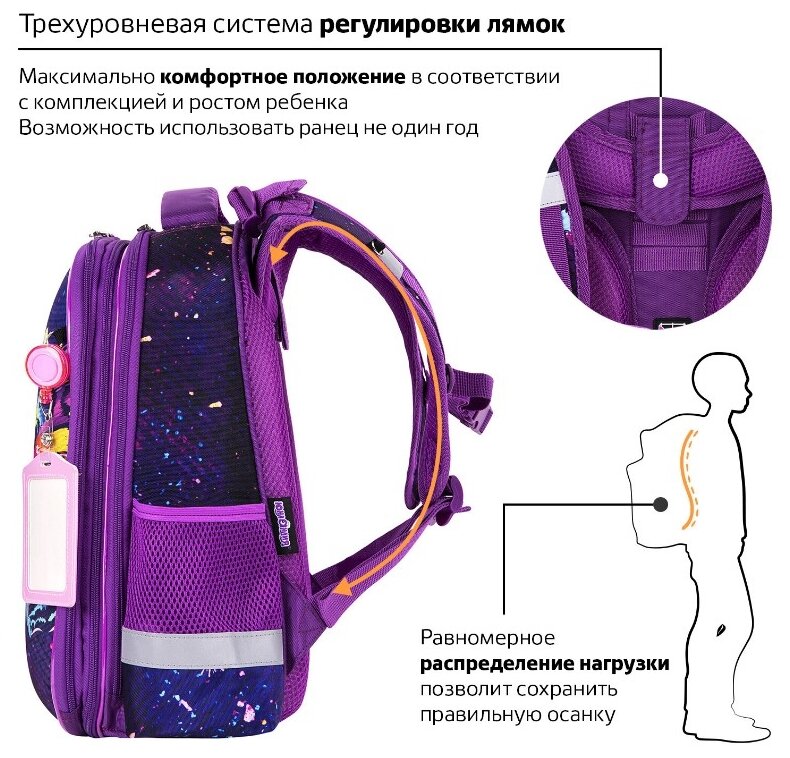 | Конструкция | жесткий каркас / ортопедическая спинка / мягкие лямки / светоотражатель |