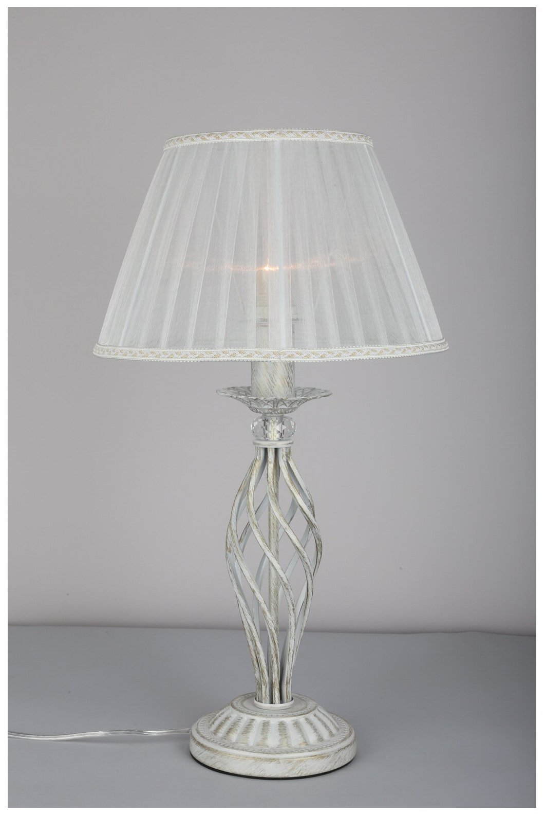 Лучшие цены. Настольная лампа, материал основания метал, цвет покрытия - основания белое золото, плафон из белой ткани. Лампа выполнена в классическом стиле, декорирована хрусталем. В лампе используется 1 лампа накаливания мощностью 60 Ватт, площадь освещения 3 кв.м. Если использовать энергосберегающие лампы, можно увеличить площадь освещения. В комплекте: гарантийный талон, схема сборки. Гарантия 2 года. Магазины в вашем городе.