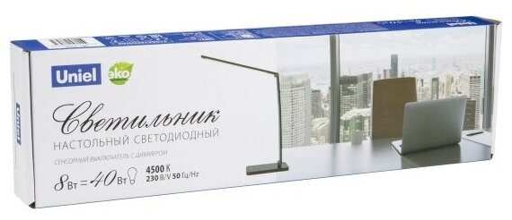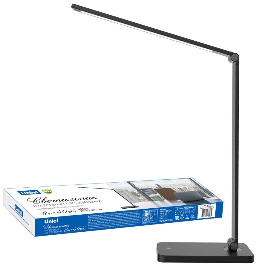 Лучшие цены. Светодиодный настольный светильник TLD-571 мощностью 8 Вт с сенсорным выключателем с диммером. Настольный светильник Uniel представляет собой оригинальный светильник, предназначенный для освещения рабочего места пользователя. В качестве источника света в светильнике применяется светодиодная лампа, эквивалентная лампе накаливания мощностью 40 Вт. Светодиодный источник света гарантирует не менее 30000 часов безупречной работы настольного светильника. Магазины в вашем городе.
