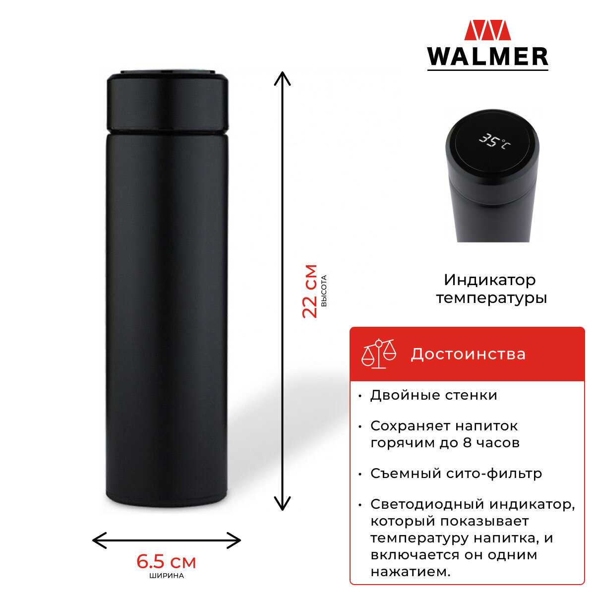 Термос Walmer Neo с индикатором температуры 450 мл, цвет черный 1 199 ₽ Подробнее