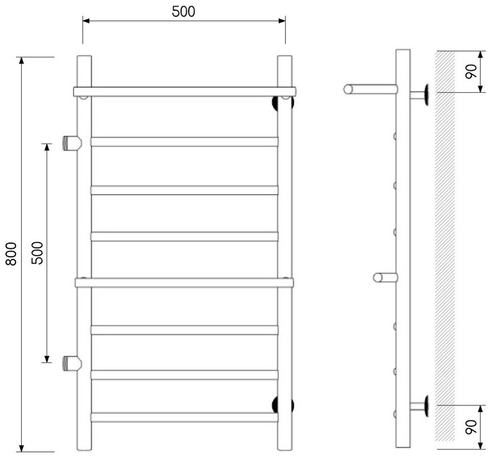 Лучшие цены. Водяной полотенцесушитель Laris Лавина П9 500х800 (L) мц 500 1" с полкой черного цвета имеет современный дизайн и прочную конструкцию. Изготавливается из нержавеющей стали марки AISI 304, которая обеспечивает антикоррозийный эффект, высокую теплоотдачу и длительную эксплуатацию устройства. Полотенцесушитель подключается слева сбоку. Проверка на герметичность выполняется пробным давлением 3МПа (30 бар). Диаметры и толщина: стойка Ø32, толщина 2 мм; перемычка Ø20, толщина 1,5 мм. Магазины в вашем городе.