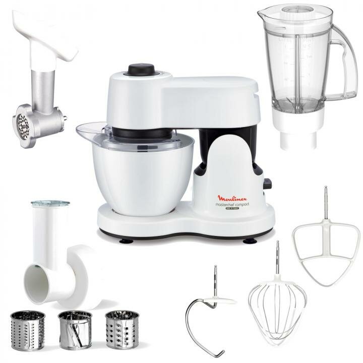 Лучшие цены. Сделана во Франции. Мощность до 700 Вт. Чаша 3,5л (пластик). В комплекте: венчик, насадка для теста(2шт), блендер (1л), мясорубка (2 диска), овощерезка (тёрка (2шт) и шинковка). Гарантия 2 года. Магазины в вашем городе.