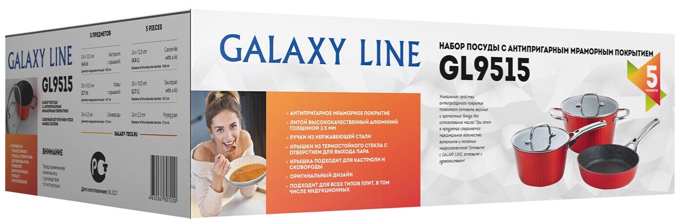 Лучшие цены. Galaxy Набор посуды GL 9515 (5 предметов) Вся посуда выполнена из литого высококачественного алюминия толщиной 3,5 мм, что обеспечивает долгий срок службы. Постепенный и равномерный нагрев позволяет готовить вкусные ароматные блюда, сохраняя максимальное количество витаминов и полезных микроэлементов. Набор посуды Galaxy имеет антипригарное мраморное покрытие, которое исключает подгорание и прилипание пищи, позволяя готовить с минимальным количеством масла. Магазины в вашем городе.