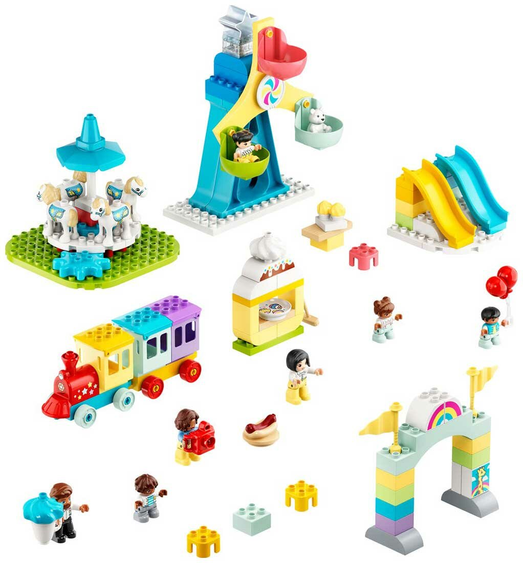 Лучшие цены. В городском парке развлечений LEGO DUPLO вас ждет удивительная подборка аттракционов, управляемых вручную функций и семейных развлечений: от маленьких горок до невероятного колеса обозрения, от поездок на поезде до красочной карусели, и от хот-догов до меняющего цвет радужного фонаря. В этом наборе есть множество забавных развлечений, способных увлечь и дошкольников, и их родителей. Содержит семь персонажей DUPLO двух женщин, мужчину и четырех детей. Магазины в вашем городе.
