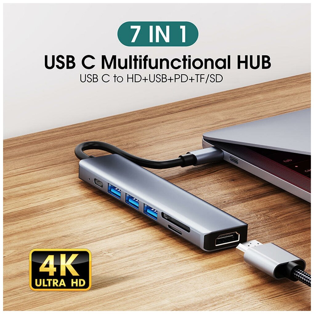 Картридеры и USB-хабы Хаб USB-концентратор (адаптер, переходник) Aluminum Type-C 7 в 1 (Grey)